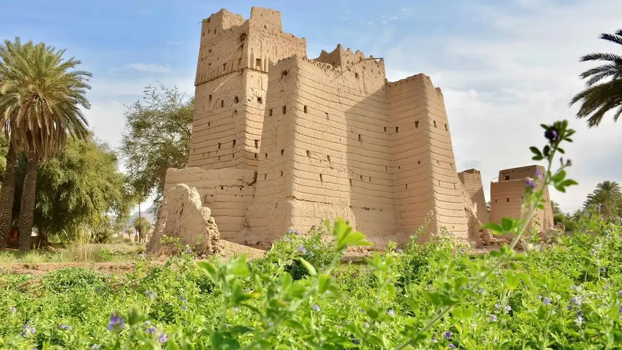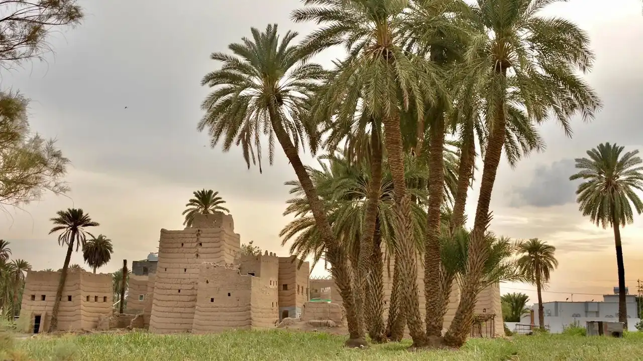সৌদি আরবের নাজরানের আল কাবিল গ্রামের প্রাচীন মাটির তৈরি বাড়ি এবং খেজুর গাছে ঘেরা একটি দিনের দৃশ্য।