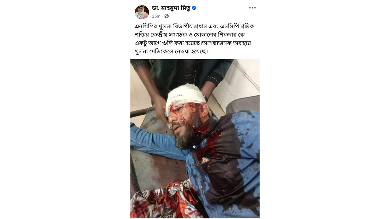সামাজিক যোগাযোগমাধ্যম ফেসবুকে এক পোস্টের মাধ্যমে হামলার বিষয়টি নিশ্চিত করেছেন এনসিপি-র যুগ্ম মুখ্য সংগঠক ডা. মাহমুদা মিতু। তিনি জানান, "এনসিপির খুলনা বিভাগীয় প্রধান এবং এনসিপি শ্রমিক শক্তির কেন্দ্রীয় সংগঠক মোতালেব শিকদারকে একটু আগে গুলি করা হয়েছে। আশঙ্কাজনক অবস্থায় তাকে খুলনা মেডিকেলে নেওয়া হয়েছে।"